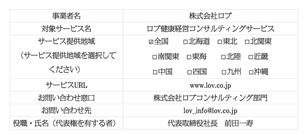 株式会社ロブ(以下、弊社)は、「健康経営コンサルティング自己宣言ガイドライン」で定められた要件を満たし、弊社が提供する健康経営コンサルティングサービスは認定取得のみを目的としないことを宣言します。